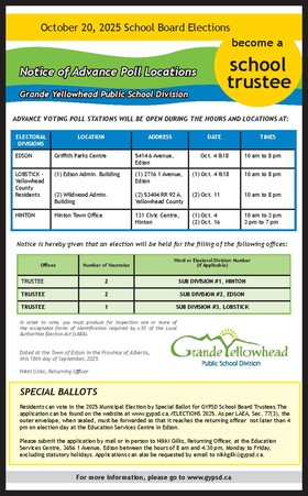 As of noon on September 22, 2025, this is the unofficial notice of candidates running for school board trustee for Grande Yellowhead Public School Division.